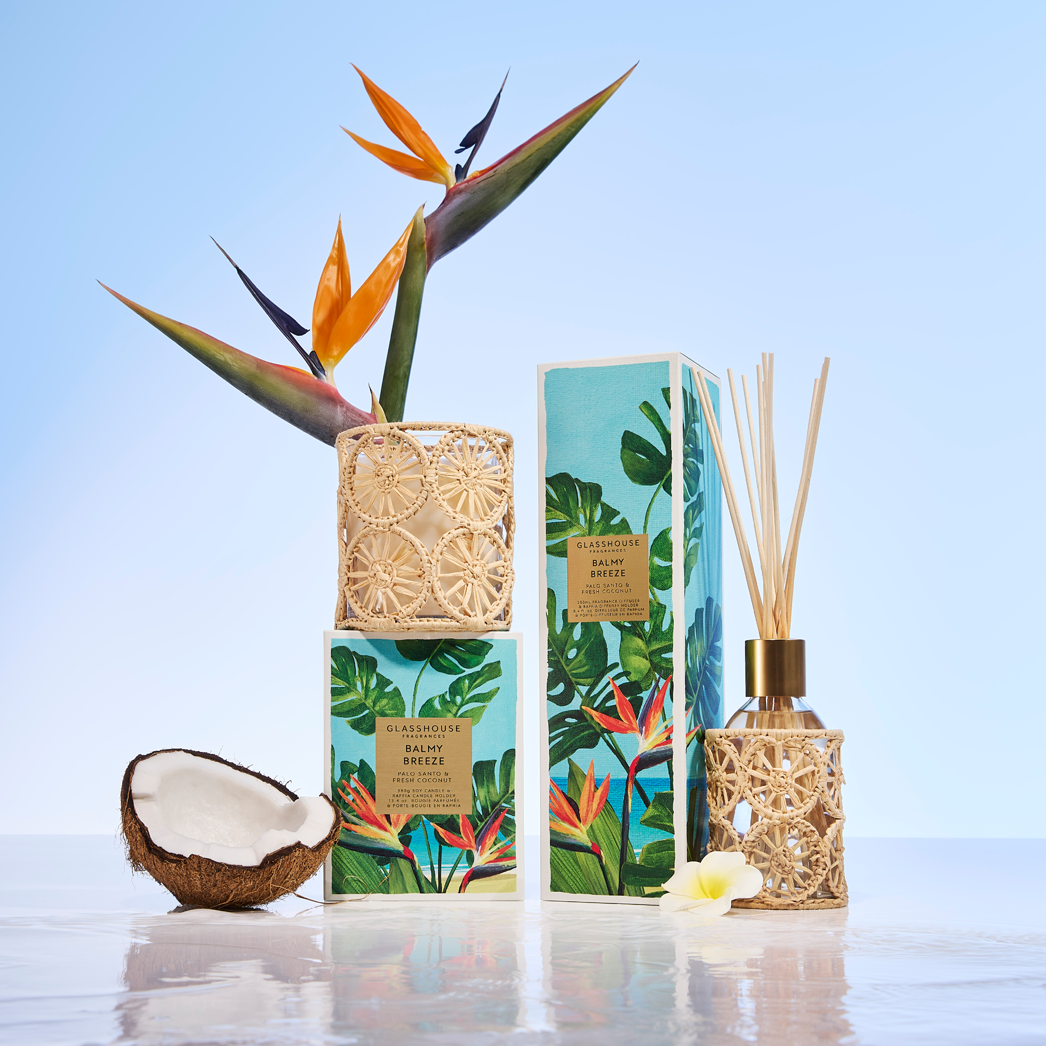 The warm, smoky allure of Palo Santo entwines with lush Frangipani and soft coconut, creating a fragrance that carries the essence of a sunlit tropical escape.