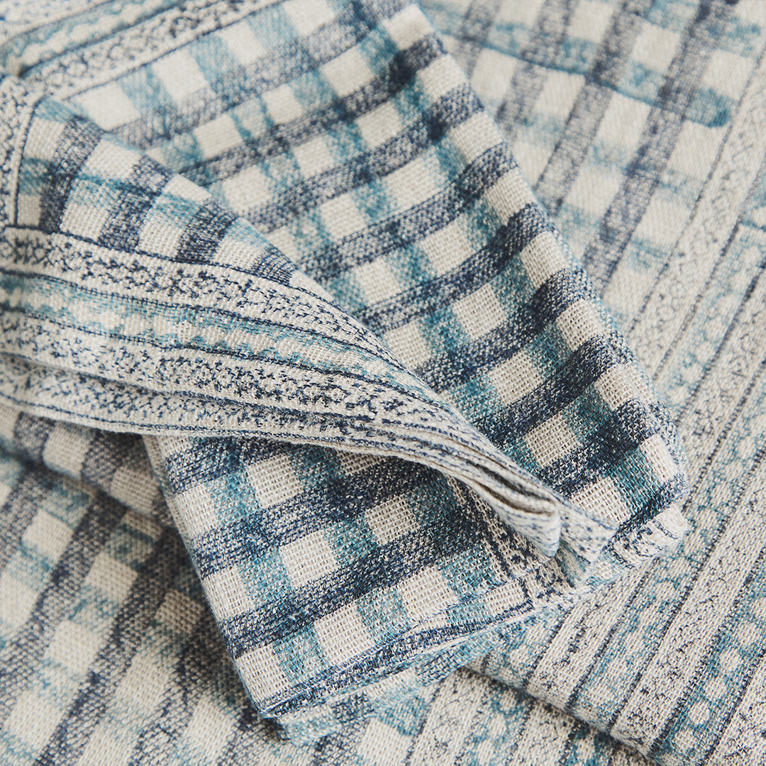 Our Checking table linen features tones of ocean and navy blue on a natural linen base.
