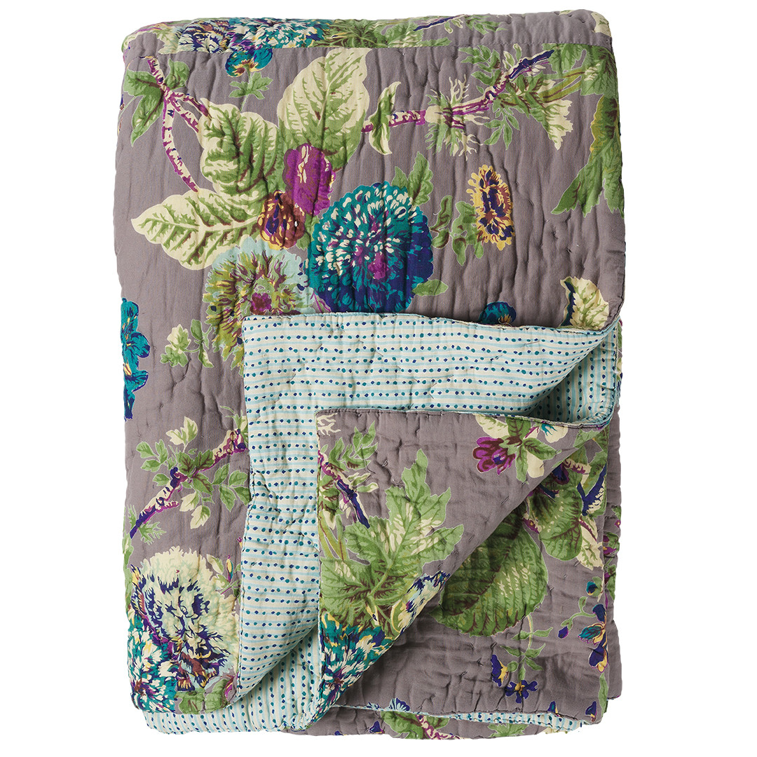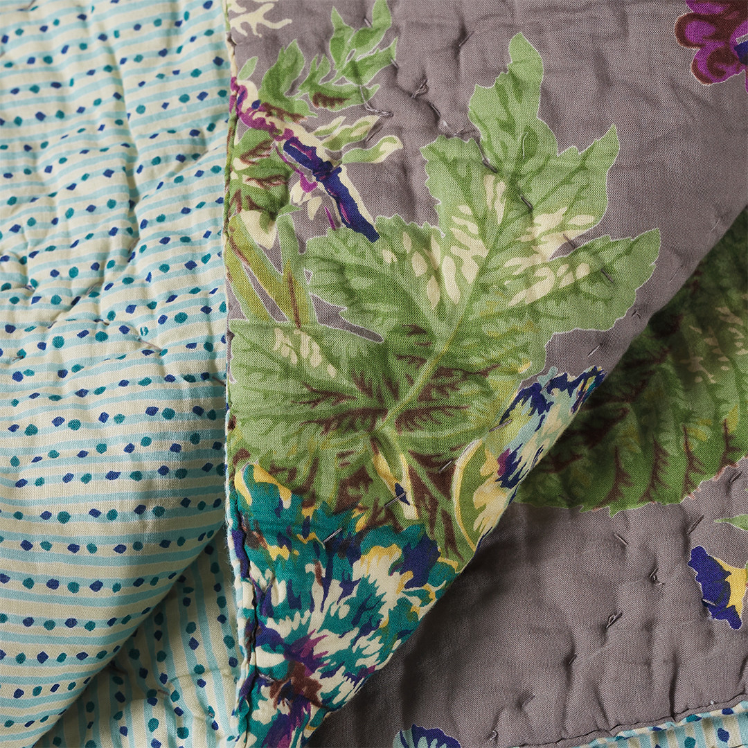 The Chiswick Collection features a striking hand-block printed floral design in greens, teals, purples and blues on an ash grey base.The Beautifully soft Chiswick Quilt comes generously sized with a gorgeous floral design on an ash grey base and a vibrant blue and natural striped reverse with a dotted pattern.