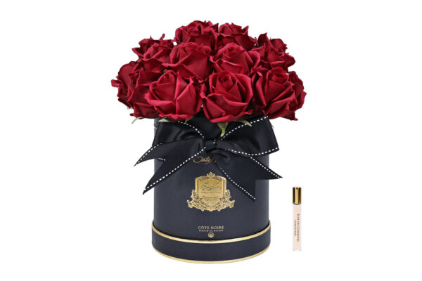 Cote Noire New – Cote Noire Hat Box Bouquet – Red – Black Box With Red Rose Buds – Hbb04